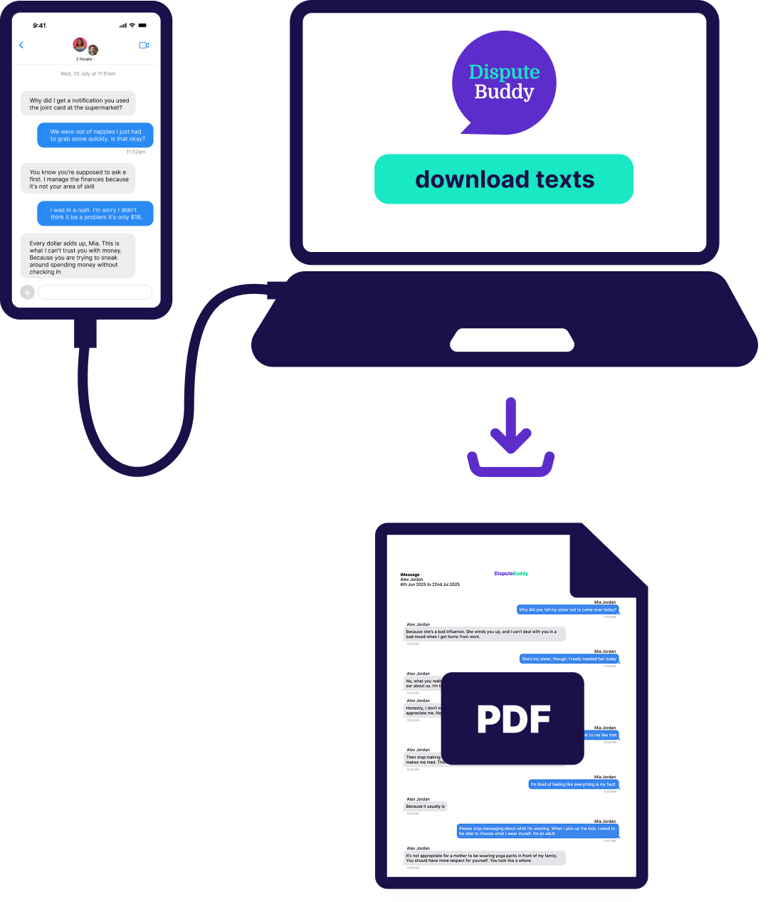 Don't relive the messages to find the right ones, or spend your money paying a lawyer to do it. Dispute Buddy means you go to your lawyer feeling organised and empowered, with all the early work already done.